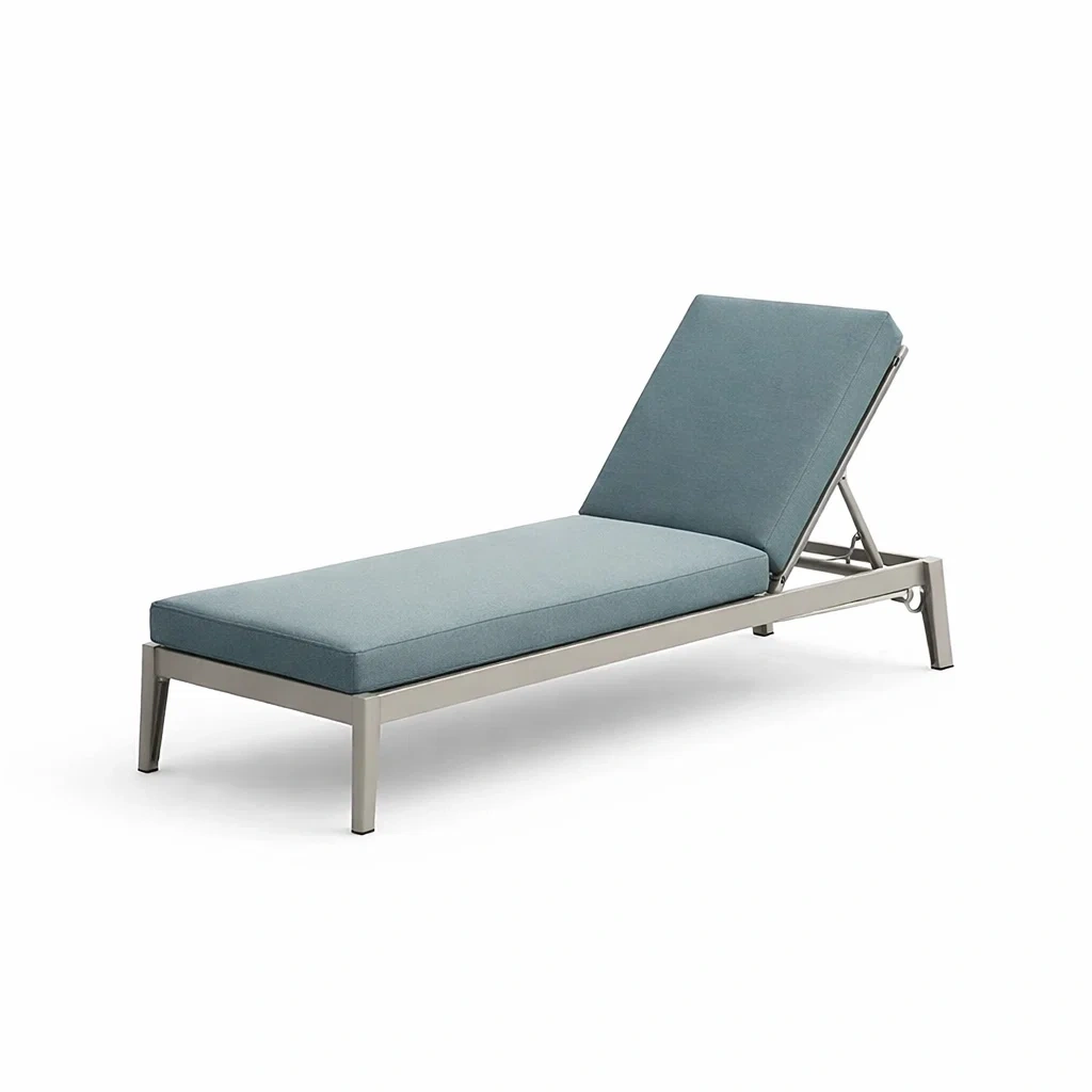 La chaise longue est fabriquée avec un cadre en aluminium et un tissu en polyester bleu.