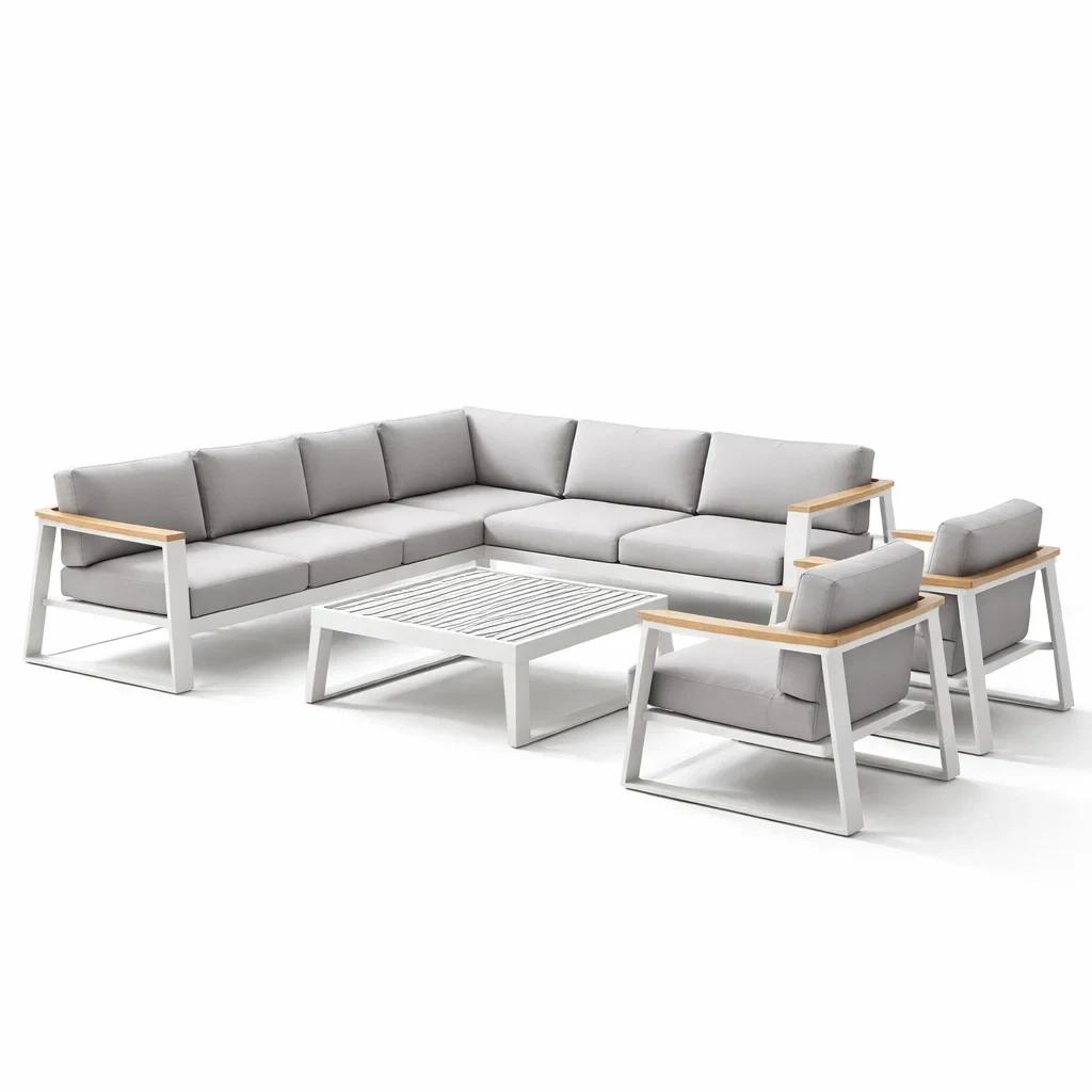 Matériaux: Cadre en aluminium, accoudoirs en bois d'acacia, coussins en tissu polyester avec rembourrage en mousse
