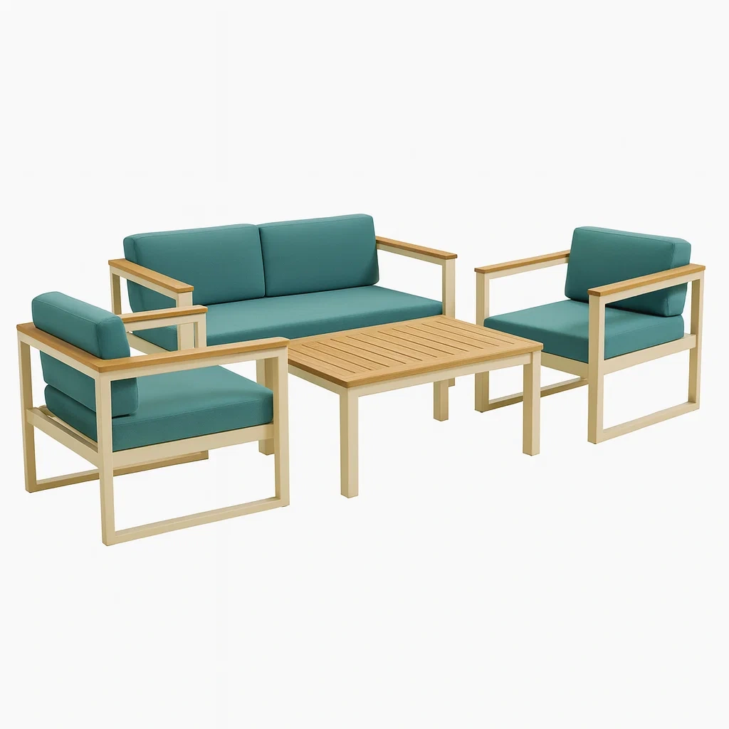 Ensemble de conversation en aluminium et teck avec coussins en polyester turquoise
